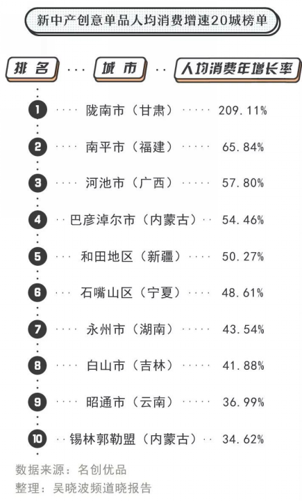 據名創優品指數顯示,在創意商品的消費上,名創冰泉、瓷感牙刷、經典音樂耳機、iF獎波浪筆記本、紅點獎頸枕等成為最常被購買的創意單品。這些商品的特點都是高顏值高品質高性價比,而且有不少還在設計上獲過國際大獎。在創意商品的消費額度上,一二線城市遙遙領先,而三四線城市的創意商品消費增長快于一二線城市,好產品的滲透力正在不斷擴大和下沉。從城市消費增速榜單可以看出,消費升級的新空間已經在往三四五線城市轉移,小城市的新中產消費潛力逐漸展露,他們在消費上越發理性并且更加注重性價比。