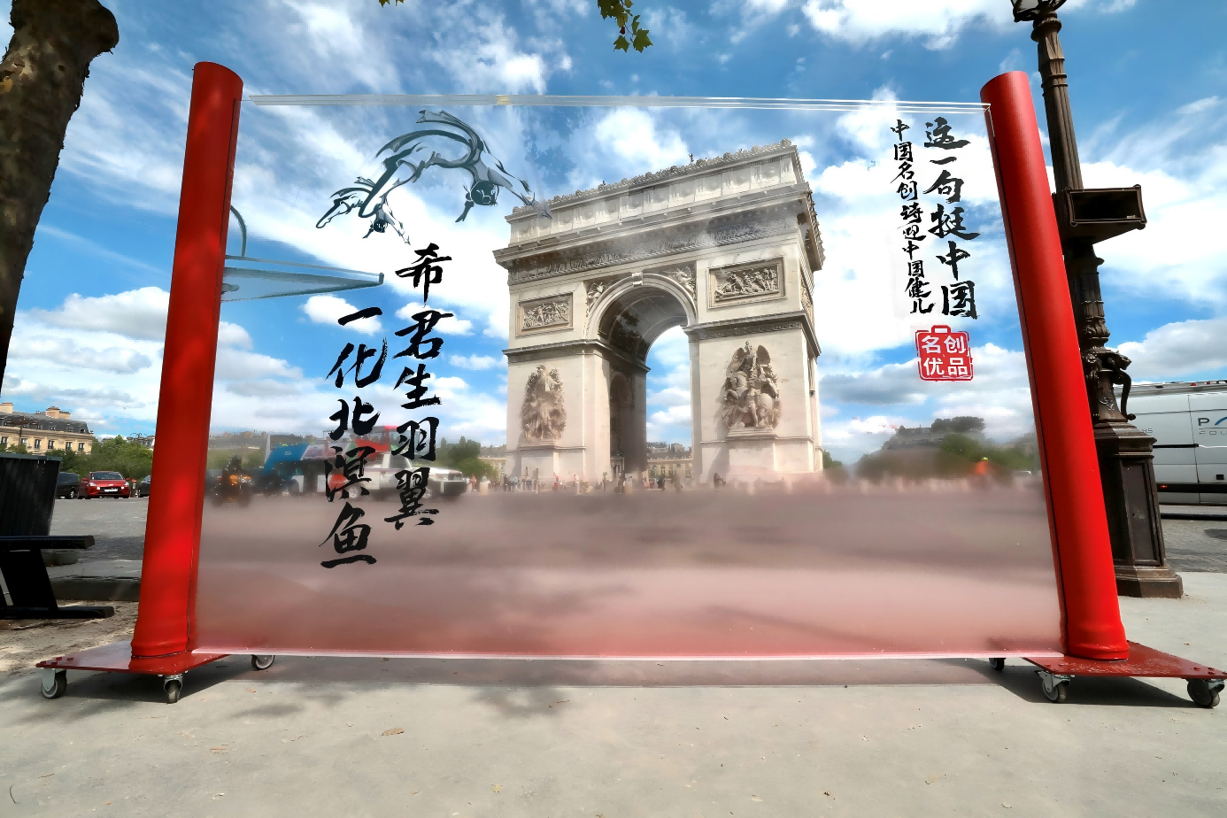 東方美學與法式浪漫相融合的應援快閃活動也在同時進行。絹紗裝置將古詩詞的魅力“書寫”在巴黎的每個角落。用千年前的詩詞,應援今日的盛會,這場別具一格的中國風巡禮讓現場的觀眾眼前一亮,也讓巴黎耳目一新。
