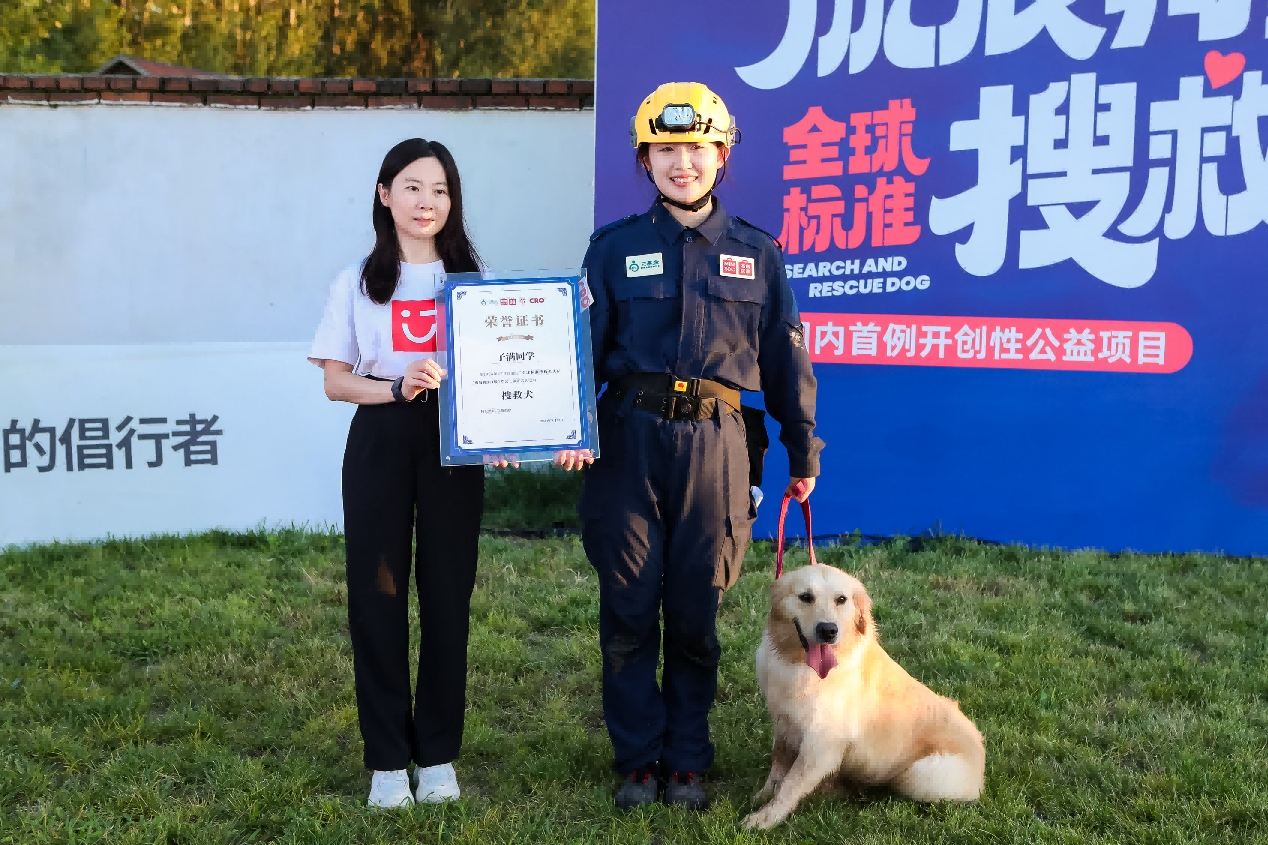 流浪犬子滿是首只接受該項目資助的搜救犬“訓(xùn)練生”,它本次所參加的是由克羅地亞搜救犬協(xié)會主席Vedran Vukomanovic擔任主考官的“全球標準搜救犬認證”考核。在考核過程中,子滿僅用8分鐘便在2000平米的廢墟上順利找到3名“被困人員”,以優(yōu)異的成績順利通過考試,名創(chuàng)優(yōu)品和它基金負責人同時為子滿頒發(fā)搜救犬榮譽證書,宣布子滿成為一只合格搜救犬。