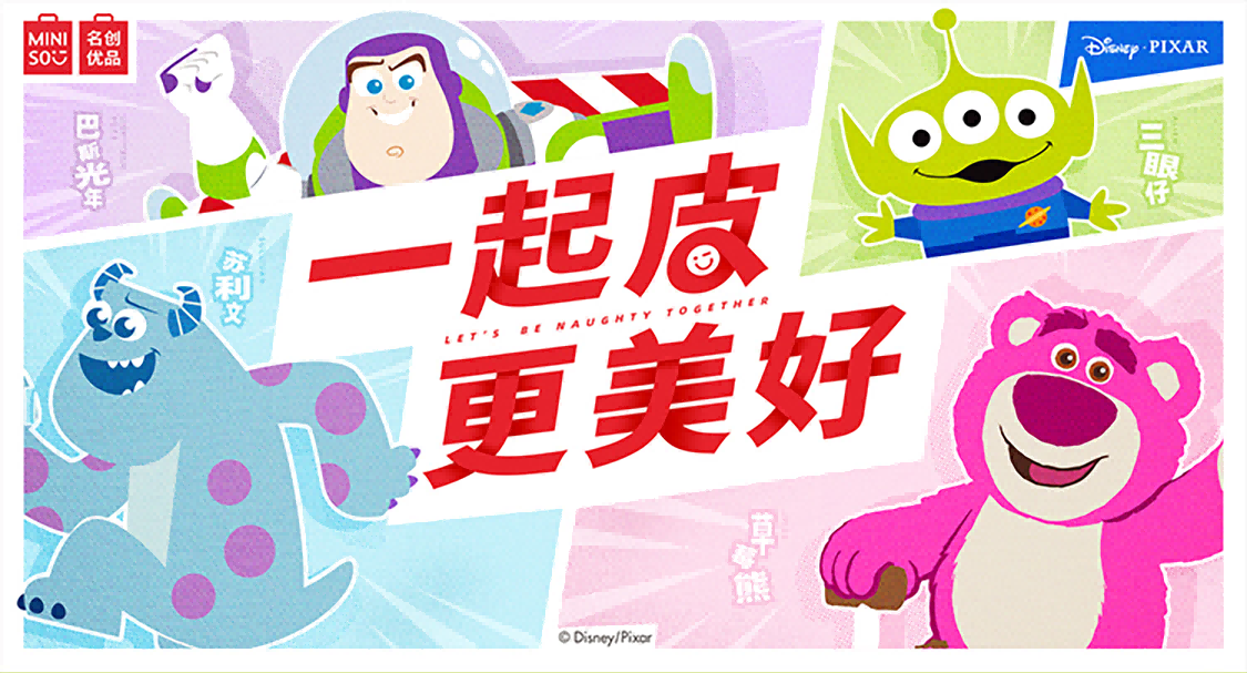 名創(chuàng)優(yōu)品在2020年正式與迪士尼合作,從此掀起了迪士尼IP聯(lián)名的狂熱玩法。迪士尼一直注重創(chuàng)新和創(chuàng)造力,旨在創(chuàng)造富有想象力并感人至深的歡樂世界,作為迪士尼的子公司,皮克斯也承繼了相同理念,而這種理念也延續(xù)到了名創(chuàng)優(yōu)品的營銷活動中。