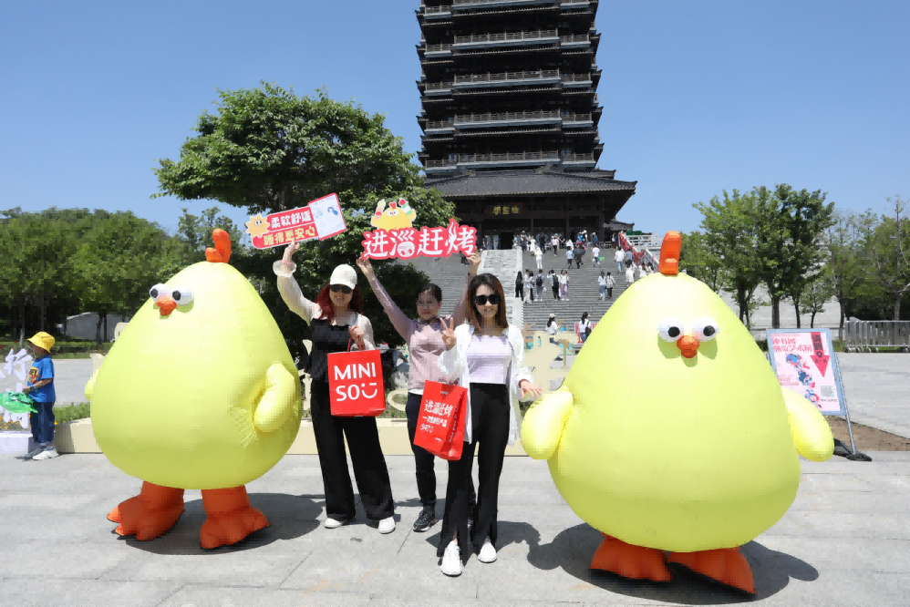 除此之外,名創優品還打造三輛吸睛的特色小推車走上街頭,開啟了為期三日的“全城巡游”,自有IP“墩dun雞”化身人偶與用戶親密互動,攜“燒烤大禮包”驚喜亮相八大局、海月龍宮、海岱樓等游客熱門打卡點,名創優品一次性旅行產品大禮包派送活動持續升溫,吸引了淄博當地眾多游客自發拍照打卡分享。